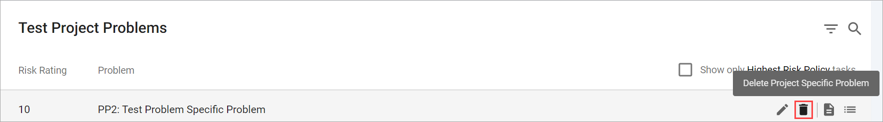 Hover the cursor over the Problem you want to delete and click on the button to remove a Project Specific Problem.