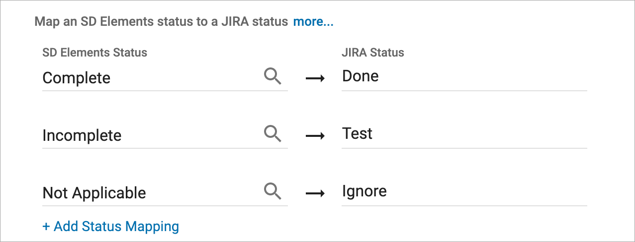 Map an SD Elements status to a JIRA status: The direct mapping between SD Elements to your Issue Tracker.